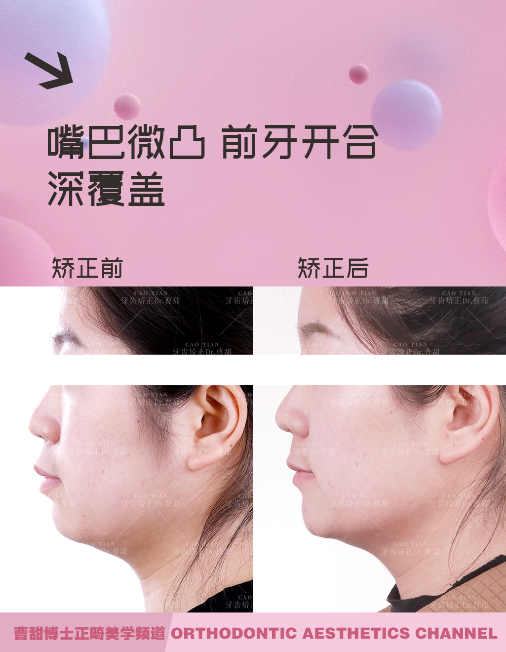 曹医生通过矫正设计内收嘴巴,让患者上下嘴唇收到审美E线以内,再引导下巴前伸,使唇、鼻、颏部协调,如今虽然还在矫正中,也可以看到她的侧貌也精致了不少。