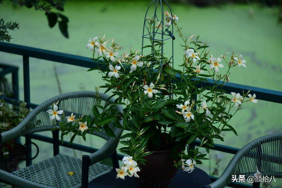 河边的水汽充足,下午4点后就没有西晒太阳了,每天傍晚浇透水,花盆小,第二天又全部干透。这些应该都是这盆飘香藤不断开花的相关因素。