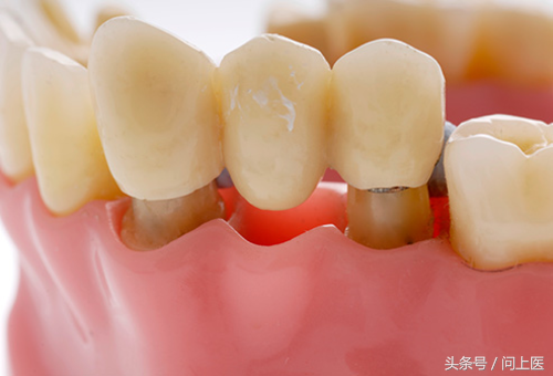 当牙齿有缺失的时候,可以使用牙桥来遮盖这种缺陷。通常情况下,缺失牙两侧的牙会被当做“支柱牙”(类似于桥墩),需要被“深埋”入牙床里(如图空隙两边深嵌入牙床的小牙齿),并且能够被套进牙桥两边的牙冠内。牙桥两边的牙冠中间有假牙,能够代替缺失的牙嵌入牙床弥补缺陷。这种方法也适用于多颗牙齿脱落的情况。