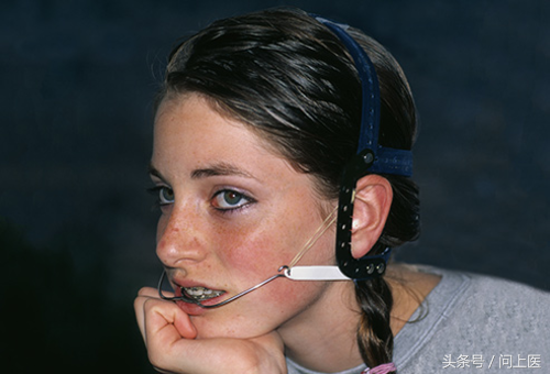这种装置虽然看起来像是中世纪的头盔,但其实它从20世纪以来才开始出现,医生使用这种夹具引导、矫正面部和颌骨的位置。如图,这种装置一部分套在头后方,并通过面弓(或矫正牙弓线)与牙套连接起来,其间产生的压力能够促使各部位矫正到合适的位置。使用正畸头帽的人一次需要佩戴数小时之久。