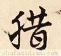 右部“昔”字上宽下窄,端庄平稳。上面稍宽,略有左收右展:左竖起笔稍高,向下略右斜,渐轻;左横与左部上面小横对应,露锋起笔,抗肩;右横与左横对应,略抗肩;右竖高起,稍重,向下稍左斜带撇意。长横与左部下面小横对应,抗肩,略呈俯势,右边渐重,收笔稍下拉。下面“日”字大小适宜,重心与上面对正:左竖注意起笔位置,竖身勿长、勿重;横折实接起笔,横画勿重,抗肩,到位后往上稍提笔锋、稍重顿笔、稍内擫写竖,稍重,稍长;里面小横略偏上,与左竖虚接起笔,稍抗肩,勿重;最后底横略抗肩,实接两竖。