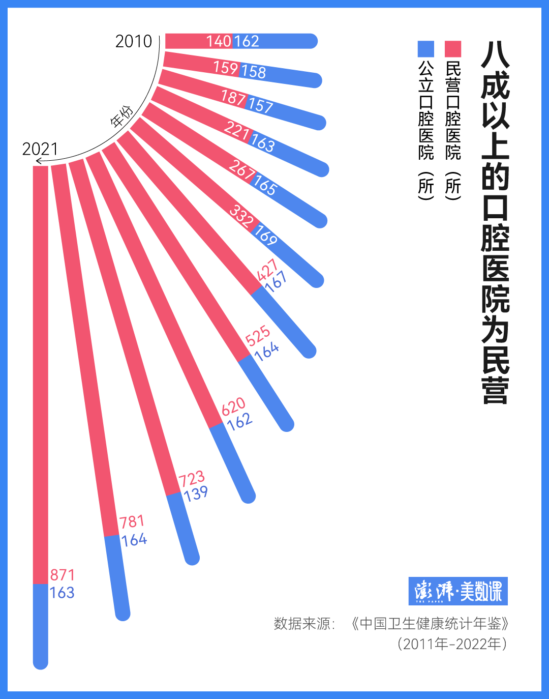 这就不得不提正畸所在的这个领域:口腔科是民营化、市场化最高的医疗行业,且大部分服务都没有纳入医保。根据《中国卫生健康统计年鉴》,中国八成以上的口腔医院为民营,这还不包括星罗棋布的私人口腔诊所。