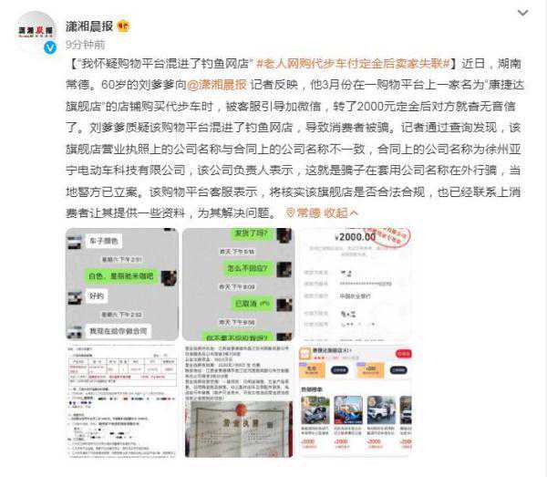 近日,湖南常德。60岁的刘爹爹向记者反映,他3月份在一购物平台上一家名为“康捷达旗舰店”的店铺购买代步车时,被客服引导加微信,转了2000元定金后对方就杳无音信了。刘爹爹质疑该购物平台混进了钓鱼网店,导致消费者被骗。记者通过查询发现,该旗舰店营业执照上的公司名称与合同上的公司名称不一致,合同上的公司名称为徐州亚宁电动车科技有限公司,该公司负责人表示,这就是骗子在套用公司名称在外行骗,当地警方已立案。该购物平台客服表示,将核实该旗舰店是否合法合规,也已经联系上消费者让其提供一些资料,为其解决问题。