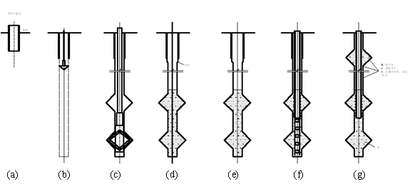 为充分发挥支盘桩优势,研发出大直径变径挤扩支盘桩。变径支盘桩,是指支盘桩主桩直径是变化的,通常是主桩上部直径大,主桩下部直径小,在成孔过程中,首先用大钻头施工上段主桩,然后更换小钻头施工下段主桩。桩上部直径大满足桩水平承载力要求,桩下部直径小,盘环面积大,桩承载力相对普通支盘桩更大,同时节省砼用量。