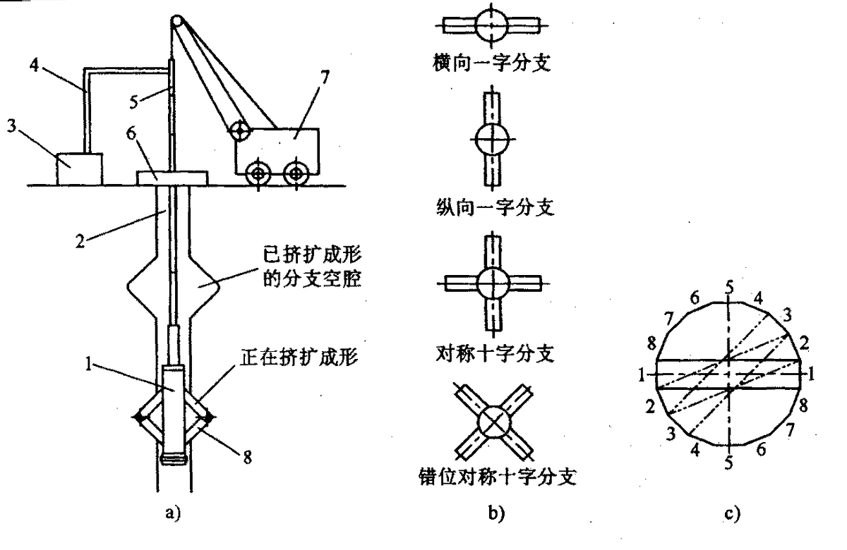 挤扩支盘桩是在已钻孔内放入专用挤扩支盘机设备,按承载力要求和地层土质条件,在设计要求部位对土体进行侧向挤压,挤扩成支或盘状孔腔,提离挤扩支盘机,放入钢筋笼,灌注桩身混凝土,形成的带有支盘结构的基桩同周围部分被挤密的土体共同作用的混凝土灌注桩。