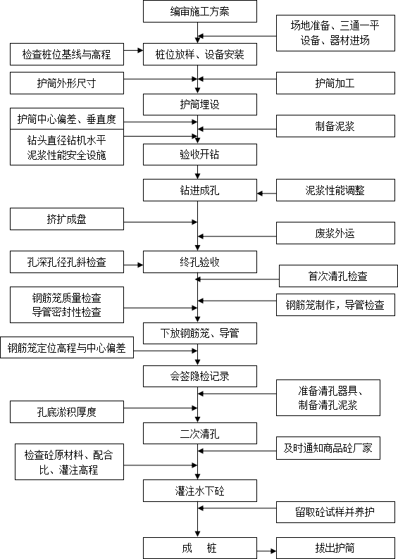 7.2.5混凝土拌制应对原材料质量与计量、混凝土配合比、坍落度、混凝土强度等级等进行检查;混凝土浇注应检查混凝土初灌量、浇注的连续性、端口埋入砼深度、混凝土导管规格和质量、桩身混凝土充盈系数等。