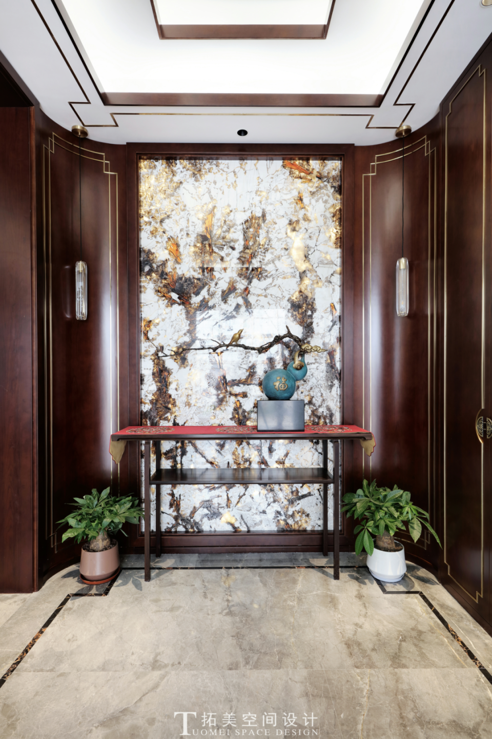 玄关承载着迎宾与展示的重要使命,设计师以奢石墙面为视觉亮点,灯光映射下的墙面金光流连,延展出奢贵典雅的气质,蓝色的葫芦宝瓶上侧枝旁生,更有燕雀报喜,摆件栩栩如生。