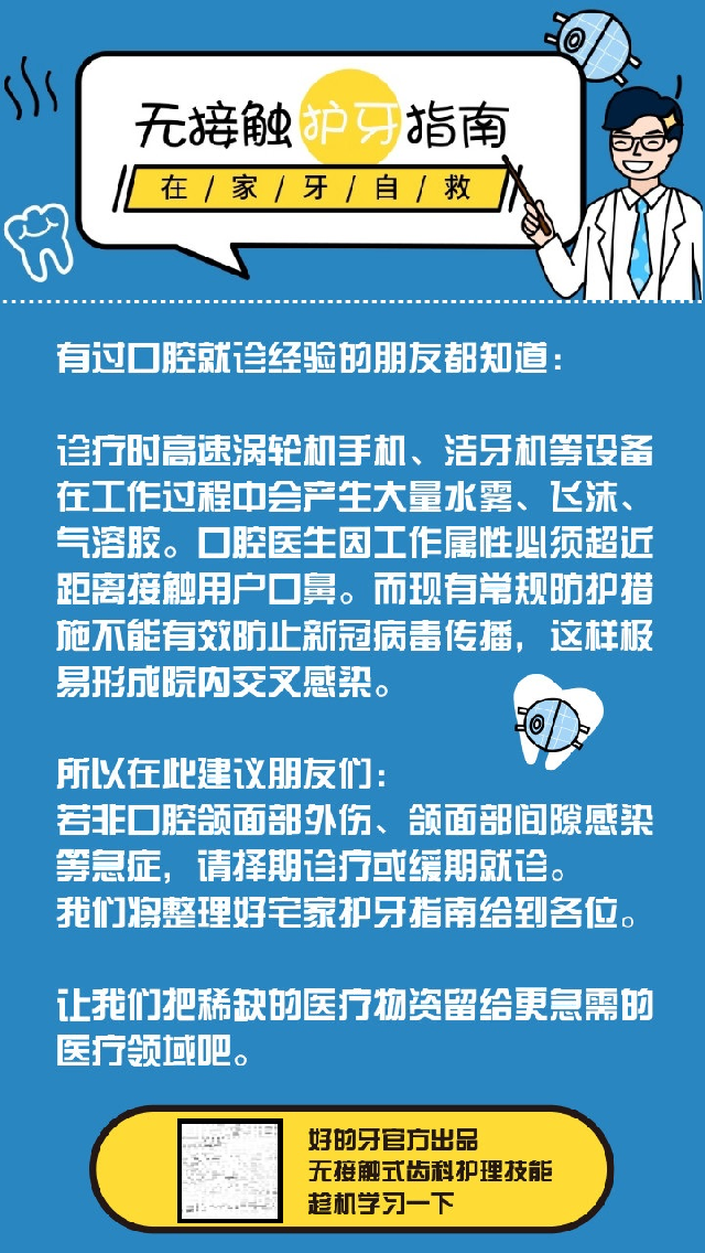 简介(原文首发【好的牙|ID:haodeya_DX】公众号)与新冠病毒相关的知识、如何做好个人及家人防护的科普,网上已经有各种各样的介绍,我们就不再赘述了。近些日子,我们发现,越来越多的口腔医院、诊所相继暂停非急症诊疗项目。但口腔问题并不会因疫情肆虐而迟来,亲们依然可能遇到牙疼、发炎等专属问题,苦于既不...