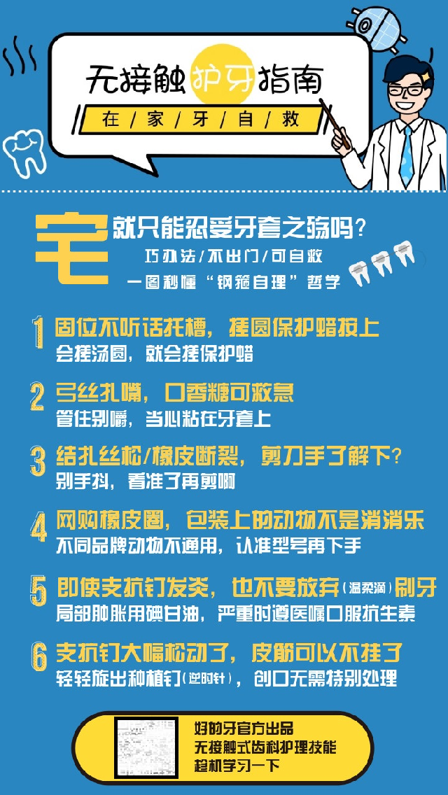 好的牙主创们通过头脑风暴及相关咨询问题的统计,整理了这份「无接触护牙指南」,希望能帮助亲们,在非常时期平稳度过疫情。