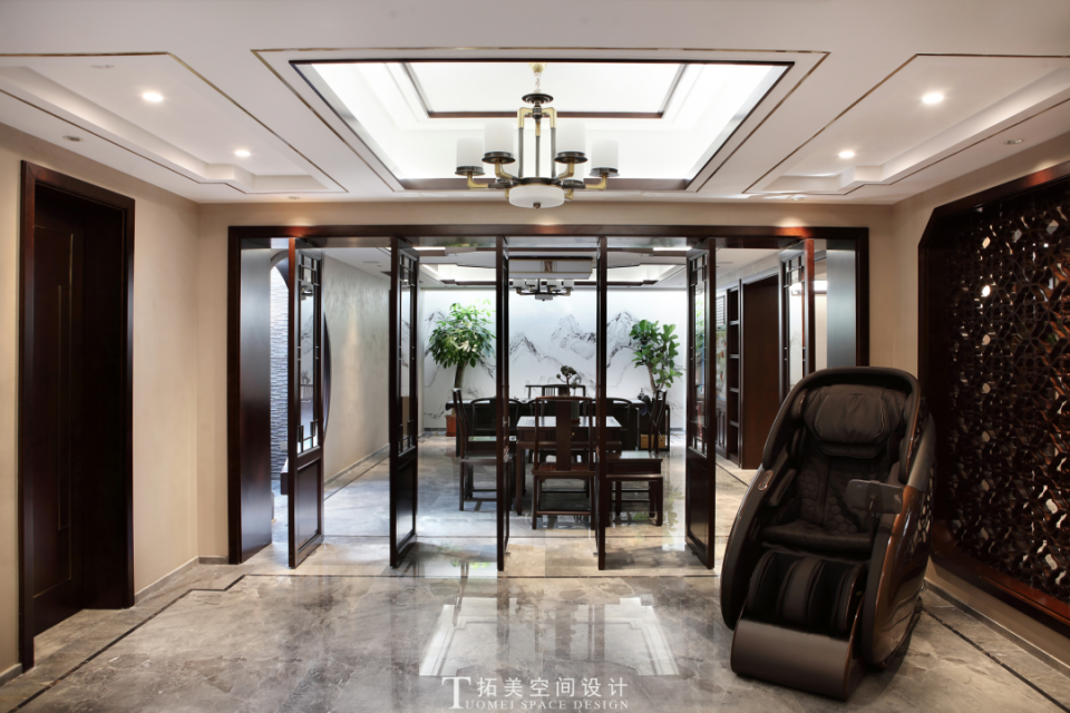 花瓶洞门连接着古朴宁静的室内与现代繁华的室外,营造出一种古典与时尚融汇的新中式的美,形成独特的视觉冲击,镂空花纹的旋转门如一幅幅轻盈排列的屏风,将隔断艺术与古典装饰融合,为空间注入一份虚实相生的朦胧感。