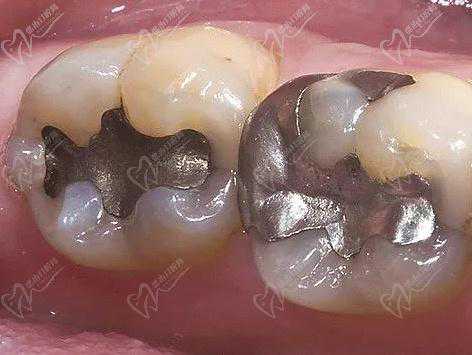 对牙有不同金属材料充填体。目前临床多采用树脂、玻璃离子充填,此情况较为少见。