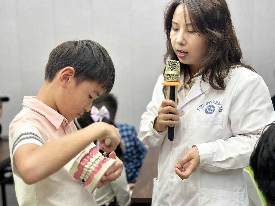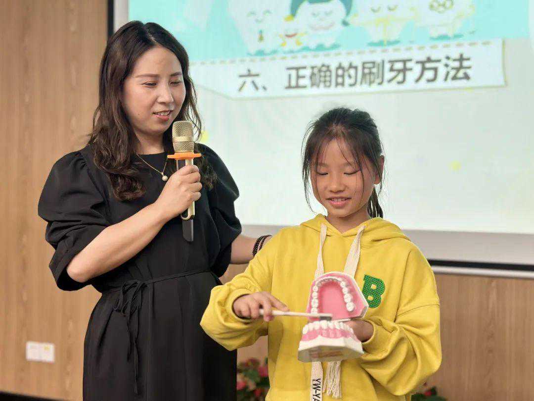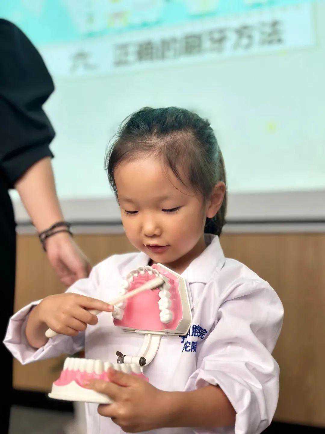 掌握了理论知识,实践操作自然也不能少。为了检验孩子的刷牙方法是否到位,黄院助现场邀请了小牙医上台给牙齿模型“洗刷刷”。