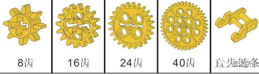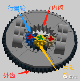 通常由大转盘和3个8齿直齿,以及用来承载行星轮的其他零件(行星架)可构建出行星轮系,其中行星架不能与浅灰色底盖固定在一起,否则内齿会锁死行星轮。