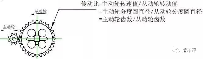 要求出两个啮合齿轮相对移动的比值,即轴的转速比,等于相互啮合齿轮的周长比。相互啮合的齿轮,主动轮转动一个齿,则从动轮也相应转动一个齿,因为齿轮每个齿间距离相等,所以计算齿数比就是计算周长比的更简单方式。