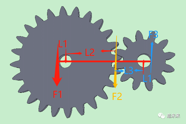 计算证明:齿轮属于特殊杠杆,支点为轴,施力点在齿轮的齿上。假定一组相互啮合的24齿齿轮和8齿齿轮,其转速比为1/3,即周长比为1/3,半径比为1/3。L1*F1=L2*F2,F2*L3=L1*F3,L2=3L3,则,F1/F3=3/1。