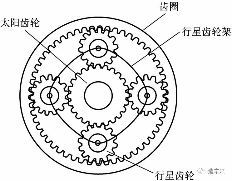 由一个太阳轮、若干个行星齿轮和一个大转盘组成,其中行星齿轮由行星架的固定轴支承,允许行星轮在支承轴上转动。
