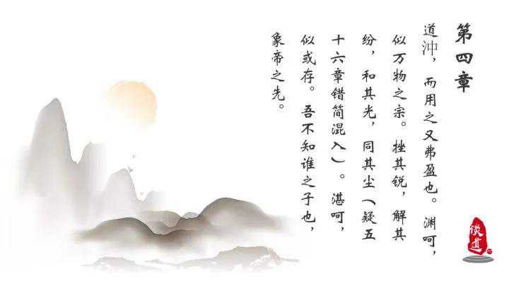 4.道冲,而用之或不盈。渊兮,似万物之宗。[挫其锐,解其纷,和其光,同其尘],湛兮,似或存。吾不知谁之子,象帝之先。