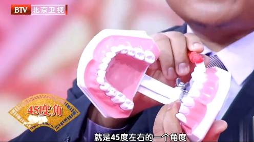 刷牙时,牙刷倾斜45°,一半放在牙齿上一半放在牙龈上,小幅度转圈刷洗。