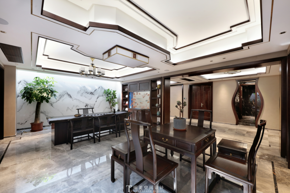 茶室,一处禅意的净土,一处寄托心灵的桃源,红木博古架与古意茶具相辉映,端庄而古朴,衬出东方文化的深厚底蕴,茶桌后是人造叠石水景,山水画石,既有远山的壮丽,又似有云雾的飘逸。