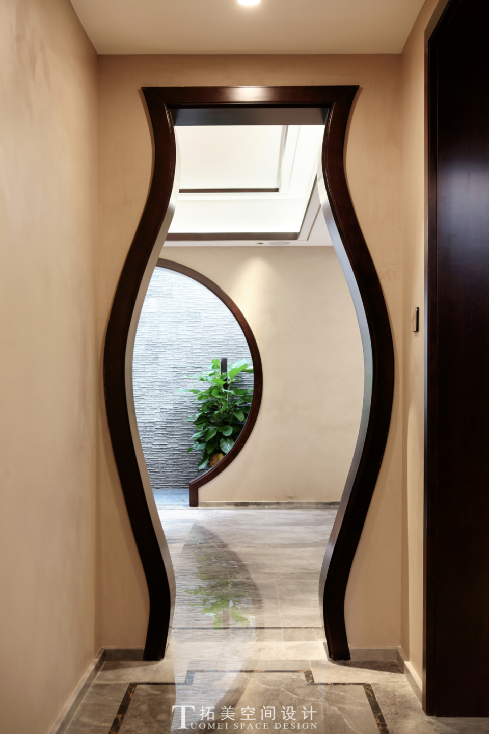 花瓶洞门连接着古朴宁静的室内与现代繁华的室外,营造出一种古典与时尚融汇的新中式的美,形成独特的视觉冲击,镂空花纹的旋转门如一幅幅轻盈排列的屏风,将隔断艺术与古典装饰融合,为空间注入一份虚实相生的朦胧感。